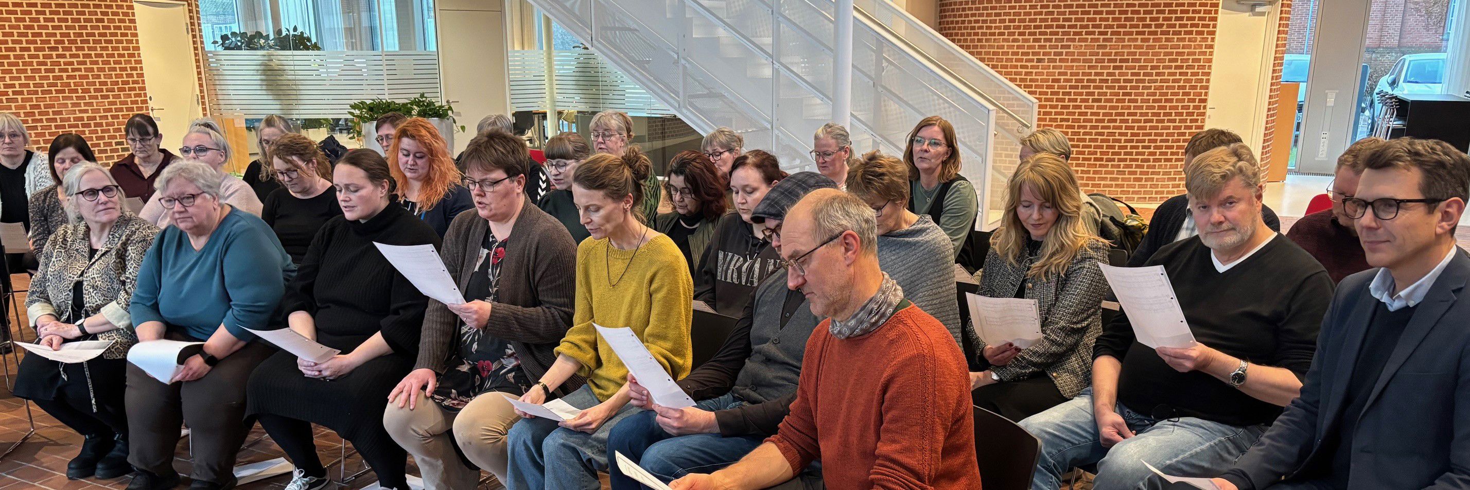 Medarbejdere fra rådhuset i Tønder synger i kor sammen.
